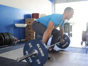 - The Pull: Push into the floor and try to have your chest and hips rise together. As the bar passes your knees, continue sweeping it back to stay tight to your body.